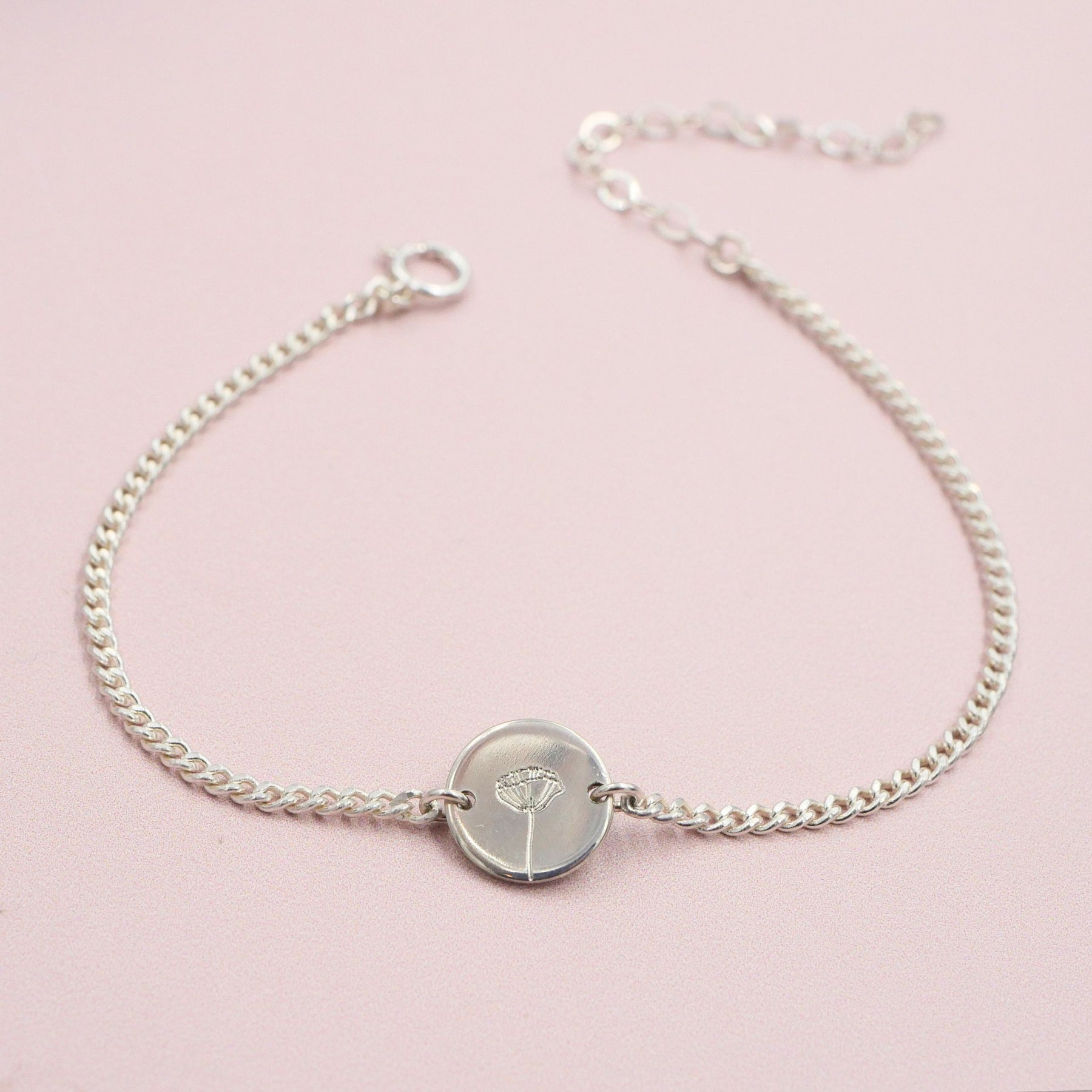 Our Birthflower Disc Bracelet features a tiny engraved disc with the birthflower of your choice hanging along a sturdy curb chain. Finished with a spring ring clasp and extender, making it easy to wear and adjust for the perfect fit.
