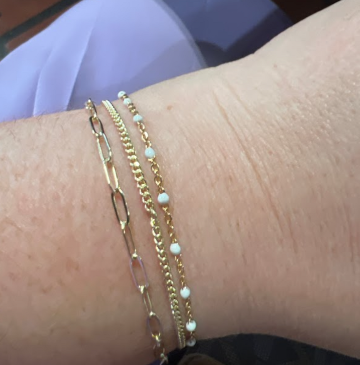 Add a personalized bar charm in 14kt gold filled or sterling silver to your permanent bracelet. Choose a name, initials, word or date. We engrave it for you on-site and weld it onto your bracelet.