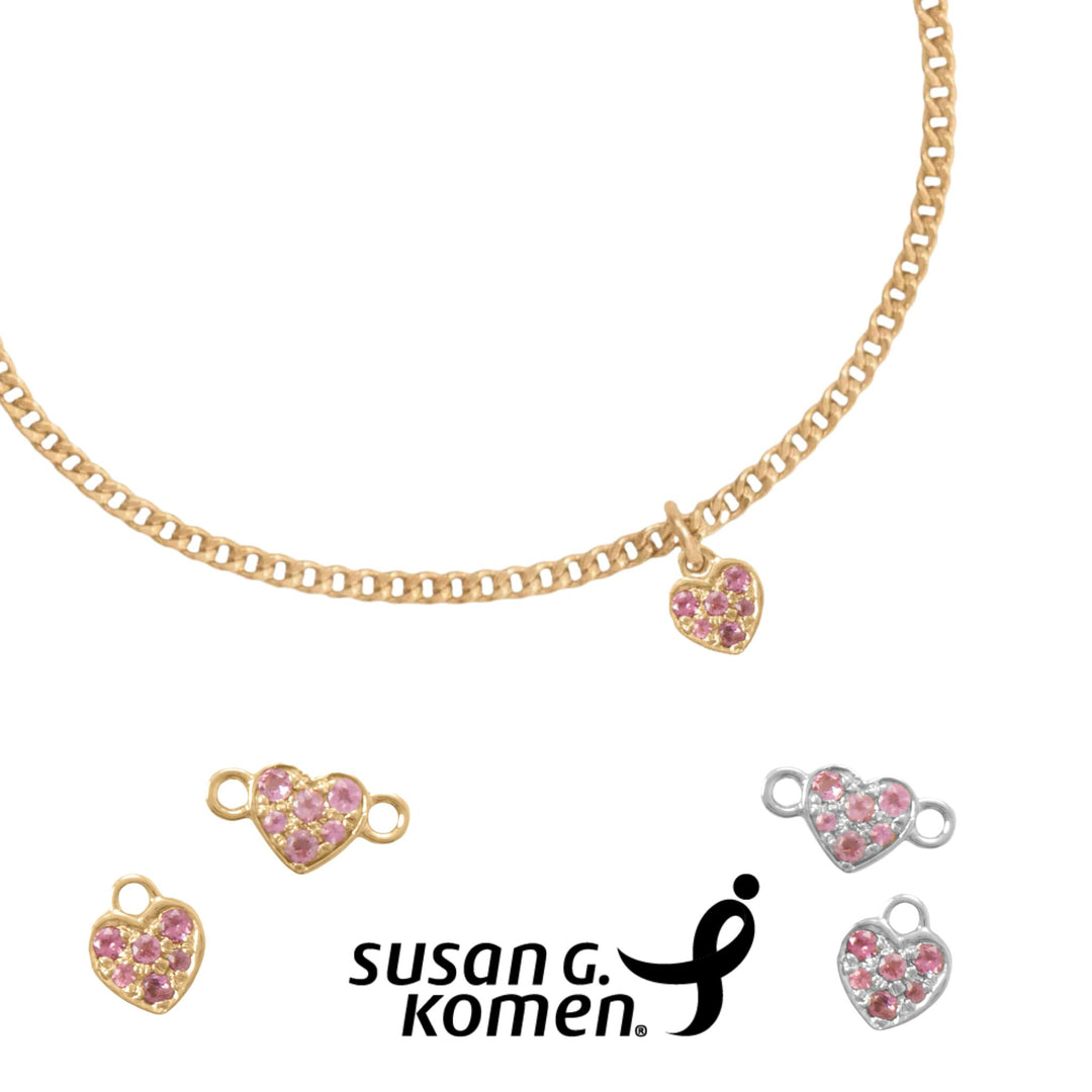 Our 14kt solid gold and pink Tourmaline heart charms can be added to your permanent bracelet or anklet. 30% of each charm sale is being donated to the Susan G. Komen Foundation. $140 each. Learn more.