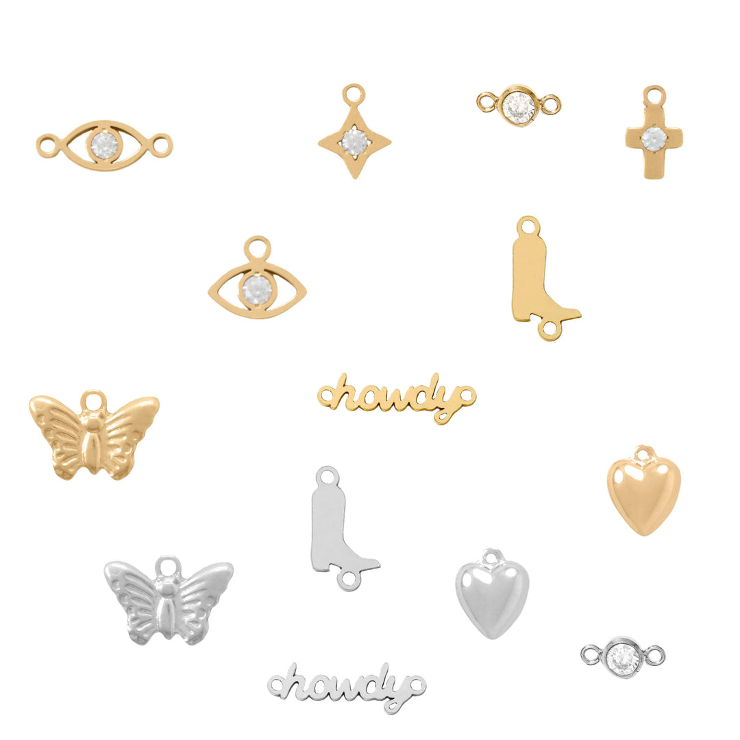14t Gold filled and sterling silver charms. Butterflies, boots, birthstone charms, stars, evil eyes and more. $16 each.