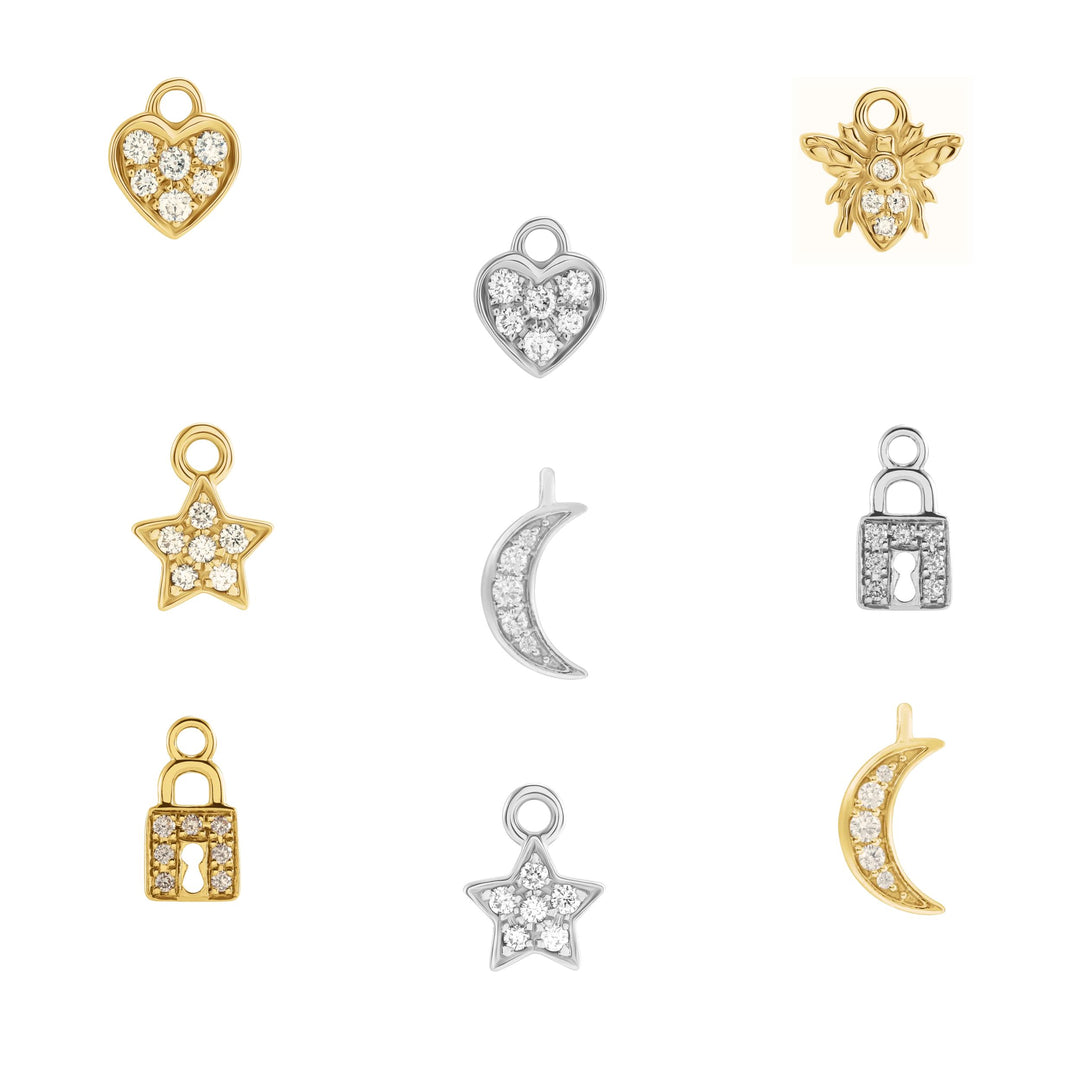Solid 14kt gold charms with natural diamond accents. Heart + Bee $140. Star, Moon and Lock $120.