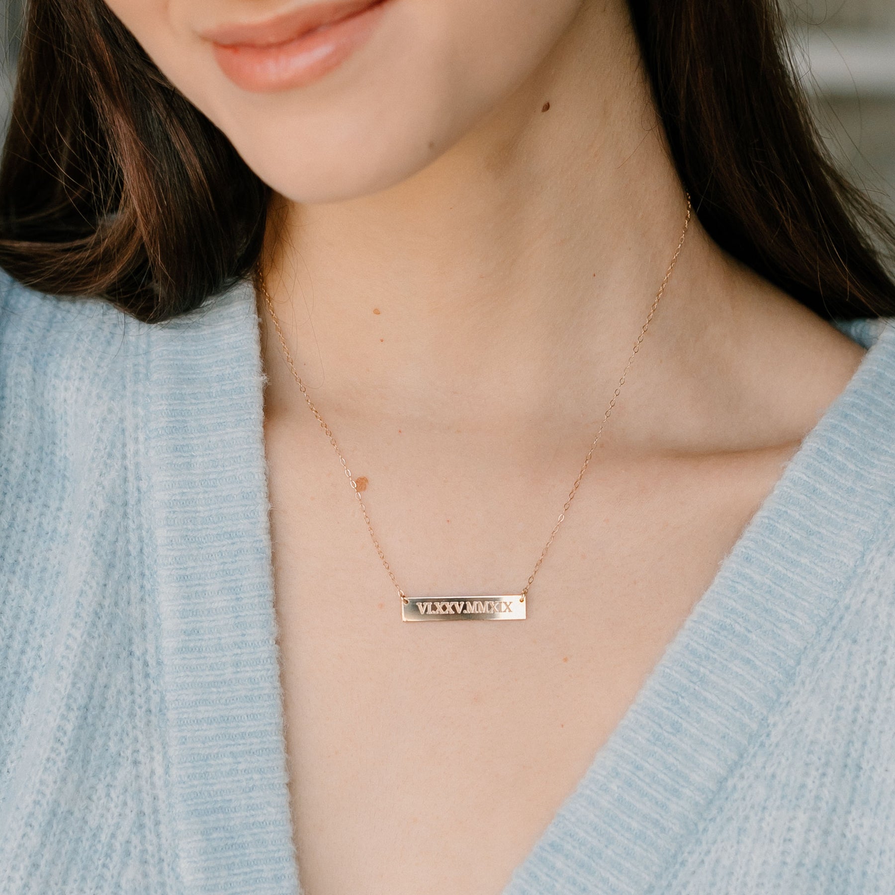 Our Personalized Bar Necklace is the perfect canvas for your meaning. Choose a name, special date, roman numerals, initials, or even custom coordinates to create a piece that's uniquely yours.