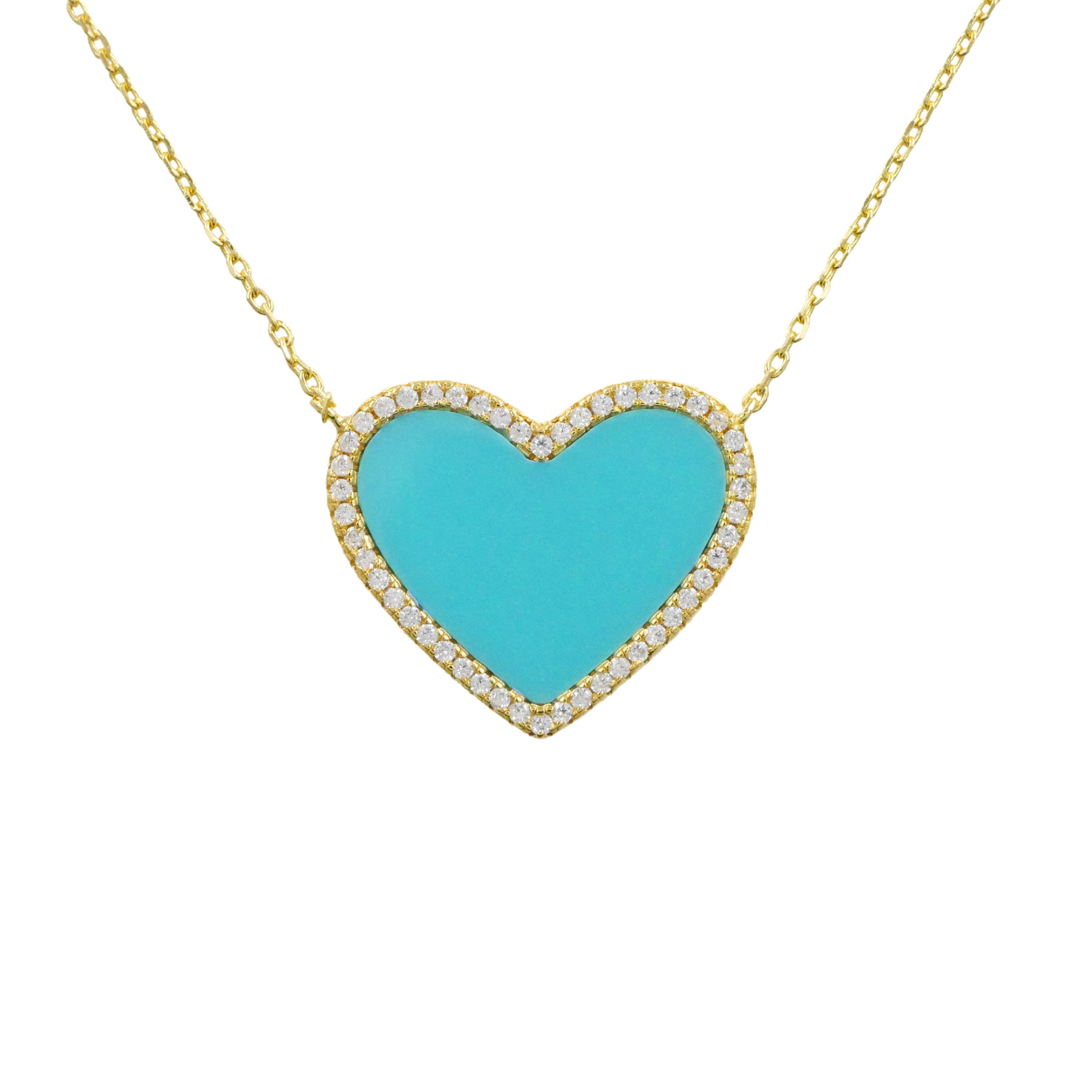 A heart-shaped Turquoise pendant is adorned with a border of sparkly white pave crystals. The built-in extender makes this piece perfect for layering. Choose gold or silver.